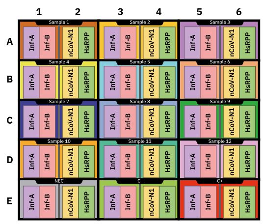 The test kit employs a pre-loaded microchip kit with the primers & probes lyophilized in the microchip for testing of the Influenza A, B, and SARS-CoV-2, as research use only (RUO) application.