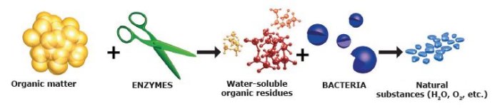 Enzymes transform organic matter into smaller water-soluble residue. This broken-down residue is easier for bacteria to assimilate; these bacteria then transform the residue into natural substances during the purifying process.