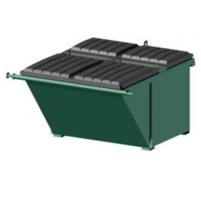 Capacity 3 cubic yards. Steel floor 10 GA. Steel walls 12 GA. Capped bottom channels profiled 3 ". Upper edge channel 10 GA. 2 polyethylene lids 31 " X 31 ". Draining valve.
