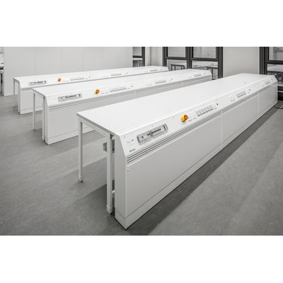 With the rear-side container, the media supply can be organized neatly at the rear of the table. In addition, by the rear-side routing of the media to supply the equipment, an area or passage for installation or maintenance can easily be created. The rear-side container can be combined with all series.