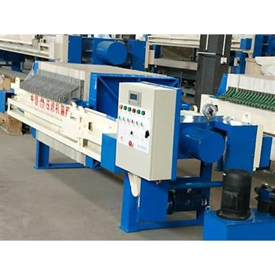 A recessed plate filter press is made up of polypropylene with a concave depression and a hole in the center of each. Two plates join together to form a chamber to pressurize the slurry and squeeze the filtrate out through the filter cloth lining in the chamber. It is capable of holding requirement plates adjacent to each other, depending on the required capacity. When the filter press is closed, a series of chambers is formed. The differences with the plate and frame filter are that the plates are joined together in such a way that the cake forms in the recess on each plate, meaning that the cake thickness is restricted to 30mm unless extra frames are used as spacers.