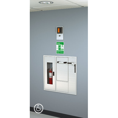 Recessed safety center with barrier-free eye/face wash and shower safety station, matching fire extinguisher housing, ceiling mounted recessed shower head, and drain pan. Stainless steel cover provides attractive appearance and protects unit when not in use. When activated, cover serves as pan to collect waste water and return it into unit for drainage. The integrated fire extinguisher housing creates a cohesive aesthetic for all safety equipment requirements in one location.