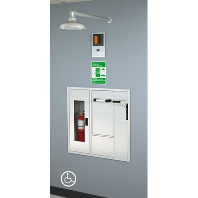 Recessed safety center with barrier-free eye/face wash and shower safety station, matching fire extinguisher housing, wall mounted exposed shower head, and drain pan. Stainless steel cover provides attractive appearance and protects unit when not in use. When activated, cover serves as pan to collect waste water and return it into unit for drainage. The integrated fire extinguisher housing creates a cohesive aesthetic for all safety equipment requirements in one location.