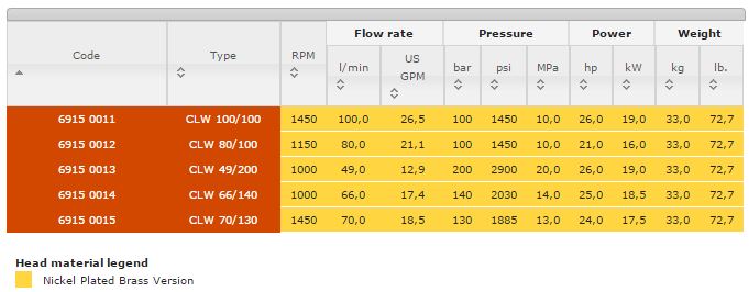 Pump body: anodized aluminium alloy. Symmetric crankcase featuring top and bottom ixing for easy right to left shaft conversion. Head: brass with chemical nickel plating. Camshaft: steel. Splash lubrication. Shaft support bearings oversized for long duration. Connecting rods: special antifriction light alloy. Guiding piston: stainless steel. Solid ceramic plungers. Suction/delivery valves in stainless steel and acetal resin. Seals: high dependability. Versions in direct drive mount with shaft positionable on the right or left or through shaft.