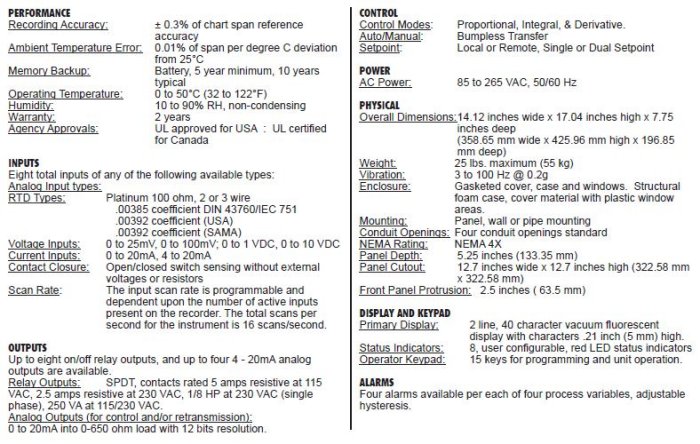 Anderson introduces the AV-9000. a revolutionary circular chart recorder.  It features a four-color marker pen cartridge which prints information as it glides across 12 inch charts. Chart reading is simplified by providing color coded trend lines, scales and alphnumeric data. Plain paper charts are far superior for record retention than "fax type" thermal paper used by competitors. Optional PID control is available on any four inputs. The 40 character vacuum fluorescent display coupled with the integral keypad make the AV-9000 easy to program for users at all skill levels. The case is designed to easily retrofit existing name-brand recorder cutouts.