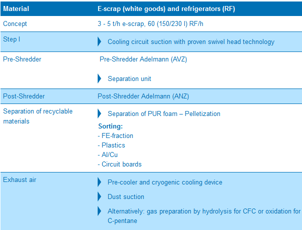 The recycling system for refrigeration devices and e-waste consists of shredder, a separation unit for PUR foam, iron, synthetic material and aluminuim/copper, a pelleting press and a exhaust air decontamination system.