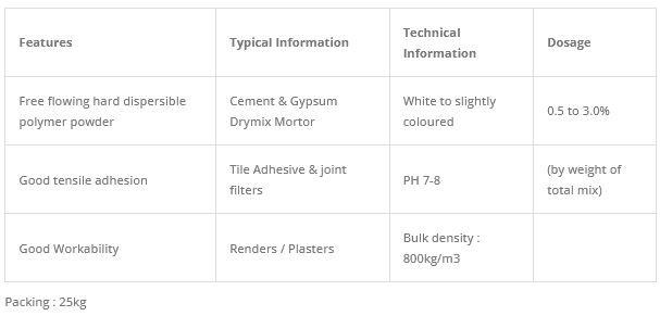 Redispersible Polymer Powder it is dispersible in water and has good saponification resistance. Compounds modified with AKULPOL-9192(RD Powder) exhibit improved adhesion, flexural strength in bending, deformability, abrasion resistance and are easier to process. Leveling, thixotropy and water retention are essentially unaffected. The product is ideal for use in combination with other mortar additives intended to enhance specific properties. It is contains a fine mineral filler as an ant blocking agent. It is produced without the addition of organic solvents, plasticizers and film-forming agents.