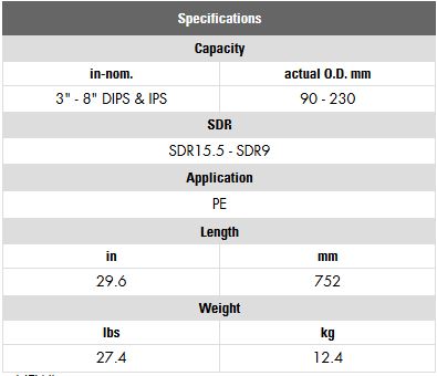 Manual, guillotine style cutter slices smoothly through PE. All aluminum construction results in lighter tool weight and greater rigidity - 22%+ weight reduction versus prior HPC8 model. Greater pipe capacity, up to 9.06” O.D. fits true 8” DIPS and IPS for PE. Aluminum rails and crosshead have a hard anodized finish to reduce wear on sliding surfaces. Superior cuts with USA made blade.