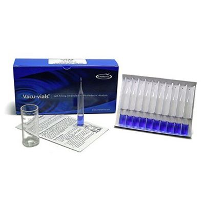 The Vacu-vials Refill Kit comes in a cardboard box and contains everything needed to perform 30 tests: thirty ampoules, 25 mL sample cup, ampoule blank, and instructions. The kits require the use of a SAM Photometer or a spectrophotometer capable of accepting a 13 mm diameter round cell and with a “Z dimension” of 15 mm or less.