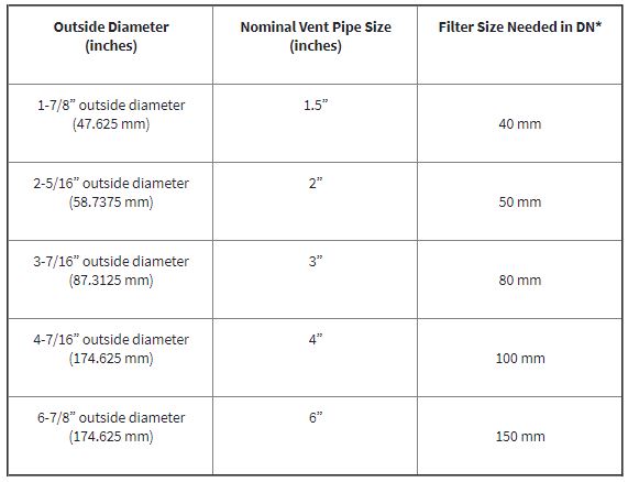 It is easy to set up and install the Cub on your roof vent. First, measure your vent pipe. Remember, you will need one filter for each vent pipe that you have. When you are measuring your vent pipe, use this handy chart to determine what size filter you need to purchase (the “nominal vent pipe size”).