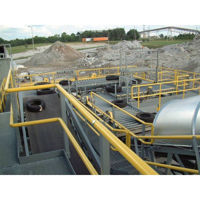 The refinement system consists of belt driven live roller conveyors in a series of turns to refine separation of tires, inspect tires and reject tires outside preset dimensional specifications. Turns in the refinement configuration will incorporate a vertical turning post to aid the tire through each corner. Also included is a tire reject bin with access door and fork truck lifting capabilities. A structural steel platform is specifically designed to support the system is provided. The platform includes handrail and one stairway access.