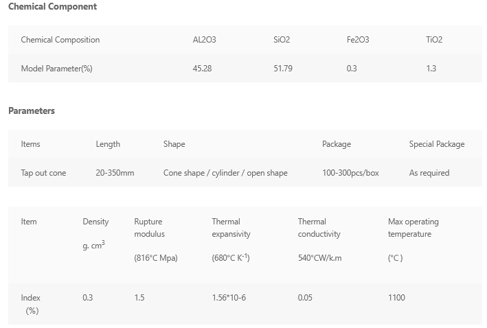 AdTech company can meet customer requirements. Refractory fiber cone is white, it can be made into a special mold according to its shape and size. All products have low shrinkage in the applicable temperature range, and maintain their high thermal insulation. They have lightweight and impact resistance. The tap out cone has good abrasion and peel resistance and is not attacked by most molten metals. It can directly touch the flame, and improve the quality of metal castings.