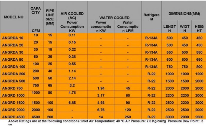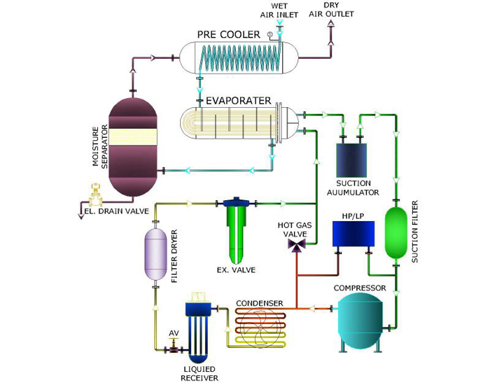 The simplest way of removing moisture from compressed air is to reduce the temperature. In Refrigerated Air Dryer compressed air is passed through a heat interchanger where cold refrigerant at around 3 Deg C is passed through the other side of the heat interchanger. At this temperature most of the moisture is condensed which is then separated and drained out in moisture separator.