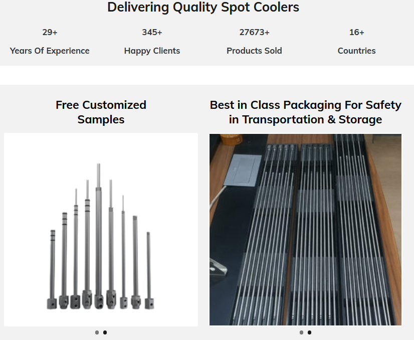 Minimise mold breakdown and maintenance time using RAGA SPOT COOLERS. Standard options for customised needs keeps mold thermally balanced. Stainless steel option gives high life against poor water quality. Easy installation for both thread type & O-ring types. Design ensures strength against breakage or bending. Options for rotatable head & hose connection gives flexiblity to use.