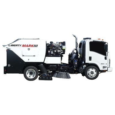The Liberty Mark III is a mid-sized regenerative air street sweeper designed primarily for curb- and-gutter type sweeping. It utilizes a full width, blast orifice style pickup head with 12-inch diameter intake and blast hoses with the intake on the right side. The Mark III is ideal for cleaning crowned streets and is equally effective for open pavement and construction sweeping. The Mark III is equipped with a high-dumping 4.35 cubic yard stainless steel hopper, 39-inch diameter vertical steel gutter broom(s) with hydraulic in-cab tilt, 105-gallon dust control system (optional 165-gallon) and is powered by a 67 hp turbo-diesel auxiliary engine.