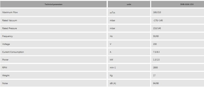 General features: Max Air flow to 2480m3/h. Rated vacuum to -730mbar. Rated pressure to 1040mbar. IE2/IE3 high efficiency is available. With Thermal protection (PTC). 100% Oil free, Easy installation, Maintance free. CE, ROHS,UL,ATEX certification approvaled. Broadband frequency and voltage used worldwide. High quality bearing used to Anti-high temperature to 180℃-200℃;