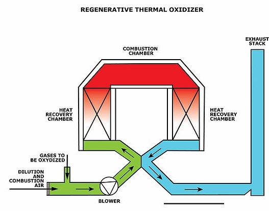 The regenerative thermal oxidizer, due to its heat recovery chambers, pre-heat the gas up to the incineration temperature and ensures that the oxidation reaction is complete in the combustion chamber.