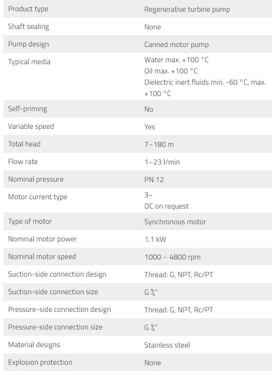 Regenerative turbine pump. Canned motor. Operation with a frequency converter. Motor efficiency level better than IE4. Fanless. Motor cast with epoxy resin: No build-up of condensation. Improved heat transfer. Protected from vibration and oscillation. Compact Suitable for the delivery of gas shares. Long-lasting