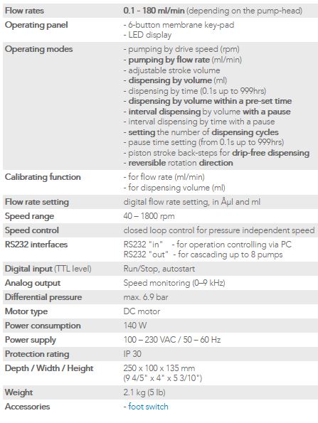 Compact dispensing pump.Microprocessor controlled drive with calibration functions.