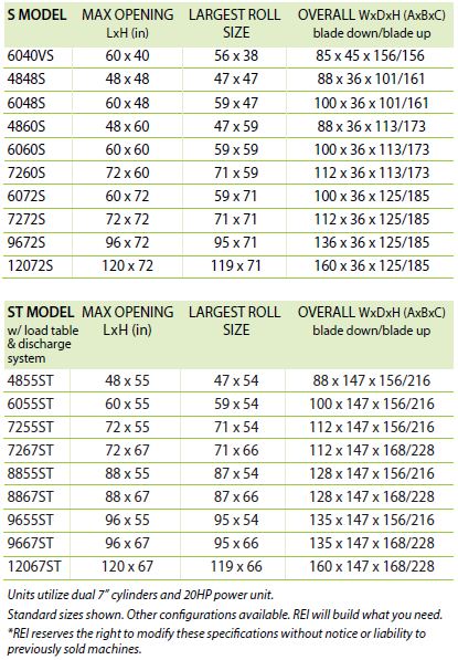 Designed, engineered and built with heavy steel throughout in our manufacturing plant in North Carolina. Perfect for virtually any core rolled products including paper, plastic film, shrink wrap, carpet, fabric, foam and light non-ferrous materials. The REI-ZR is not limited to rolled products but can also be used for flat stock and stacked material as well. The new REI-ZR ST models come complete with a load table and discharge system.