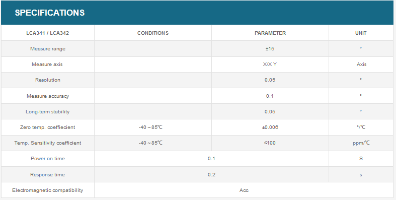 LCA341 / LCA342 series a low cost tilt switch developed by RION for application like level safety alarming and platform level monitor and alarm. There is relay output circuit inside. Alarm threshold value is pre-stable. when the inclination exceed set alarm value, it will output relay output signal(drive current 1A) to drive the solenoid valve hydraulic system or drive buzzer or alarming light for the safety of platform. Its main function is to monitor and alarm the(dual axis or single axis) inclination of platform automatically. It is well-designed, the temperature and linearity are compensated. It has short-circuit, high voltage, surge protection etc. And all its components meet the requirement of industry application.