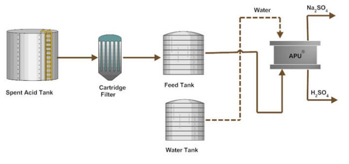 The Eco-Tec Generator Acid Purification (GAP) System is designed to separate the sulfuric acid from the sodium sulfate by employing the use of the Eco-Tec Acid Purification Unit APU System known worldwide as the standard for separating salts from mineral acids in metal processing industries. The resin used in the APU system absorbs the acid while allowing the salt solution to pass through.