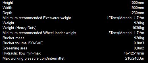 The screening bucket can be fitted to Wheeled loaders or Excavators or both using a dual mount system.The EP 2150 has an SAE capacity of 0.8 cubic metres. There are 2 rotators giving a screening area of 0.8 square metres driven by a choice of 1 hydraulic motor or 2 for the HD.The EP2150 is available with a 90 degree and 180 degree spiral blade pattern.Screening sizes vary from 0-8mm, 0-11mm, 0-13mm, 0-18mm, D-20mm, 0-27mm,0-41mm,0-53mm and finally 0-68mm.Flow requirement is 45-125 litres per minute free flow. Max relief setting is 210 BAR - The bucket requires a 2 way circuit to operate and a case drain for the leak back to tank