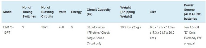 - 12 ohm maximum lead line and 2 ohm EB detonators wired in a single series circuit, based on U.S. standard detonator rating of 20 millijoules/ohm delivered in 5 milliseconds. Contact your powder company for recommendations. See SUITABILITY statement under OPERATION heading.
