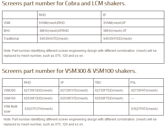 All cobra series shaker and LCM series shaker have the same shaker screen specification. It is made under 3 different screen engineering technology, with 2 different combinations; then we get 6 different choices with different part number.