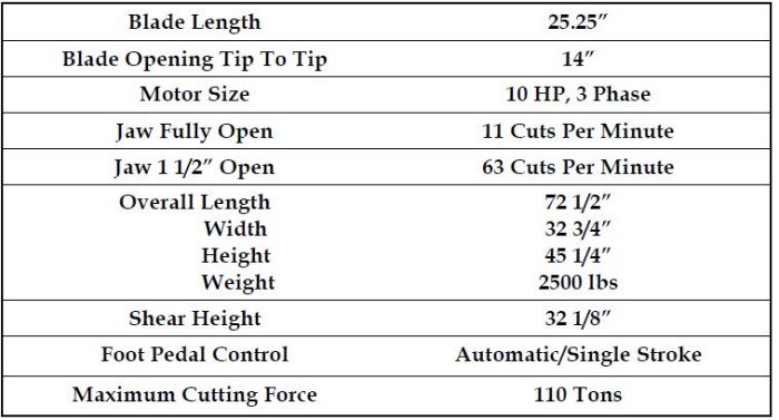 RES Model 2500LD Hydraulic Alligator Shear. 25.25" Blade Length, Blade Opening Tip to Tip 14".