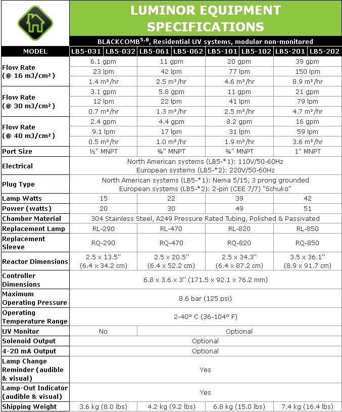 LUMINOR - Model Blackcomb 5.0 -Residential UV Water Disinfection Systems