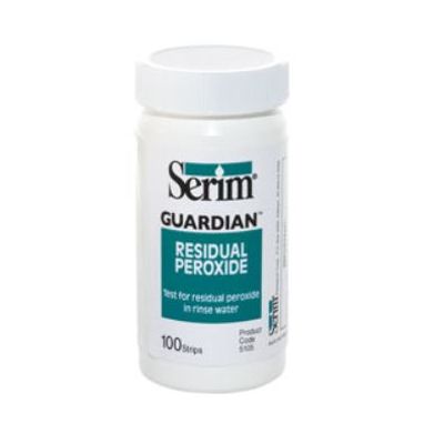 Serim® GUARDIAN™ RESIDUAL PEROXIDE Test Strips provide a rapid and convenient means for measuring the concentration of peroxide remaining in dialysate lines and dialyzers after disinfection with peracetic acid/peroxide-based disinfectants (such as Renalin®, Actril®, Minncare®, Puristeril®340, Peracidin®, PerAldecide™ and Micro-X®). Results of 3 ppm and above indicate that further rinsing is required. For more information refer to the Residual Peroxide product insert.