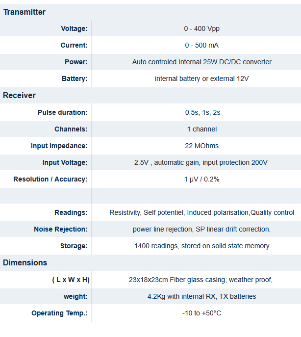 The Syscal Kid allows a direct reading of the resistivity and the chargeability (computed on 1 window). The device features 6 predefined and a user-defined arrays.