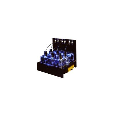 For small volume replicate respiration measurements of oxygen uptake by microbial and cells suspensions, mitochondria or enzyme preparations. The respirometer comprises a sealed water bath containing six respirometer cells located above a six-position magnetic stirrer. A black acetal electrode holder, with a 5mm hole in its tip through which the membrane of the SI130 electrode protrudes, makes a sliding fit into the precision bore cell. As the holder is inserted into the preparation, the sloping face at its tip gathers the air into the slot which runs the complete length of the holder. Respiratory inhibitors or other solutions can be introduced directly into the cell via this slot, using a fine bore needle with luer fitting, which is supplied. The volume of the cell may be set between 1 and 3 ml, by rotating the knurled collar of the holder.