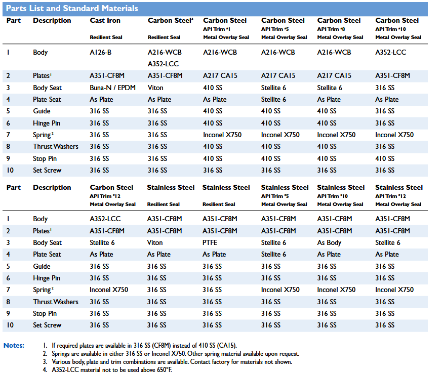 Design Features: Retainerless design meets industry fugitive emissions control requirements. This design eliminates the potential leak path to atmosphere associated with competitors’ valves with threaded retaining plugs. Available in wafer, lug and double flanged body styles. Suitable for installation between RF or RTJ (Optional) flanges. Valve sizes 6” and larger are supplied with a valve lifting lug. Upper and lower stainless steel thrust washers are standard. Available with resilient or metal-to-metal seats. Seat design lifts then swings disc to minimize seat wear. Discs are equipped with shock bumpers to minimize stress in hinge pins. Body meets ASME B16.34 and API 598.