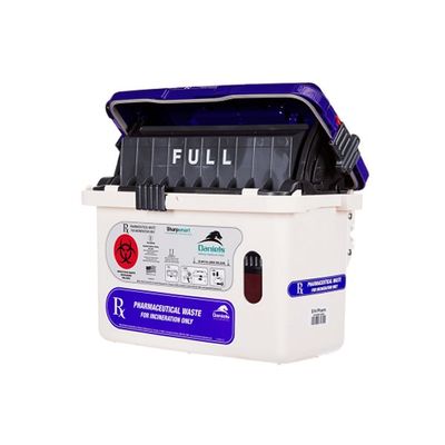 The smallest in the S-series Pharmaceutical waste container range; this container is typically used in pharmacies, drug draw-up/medication rooms and in wards. The sharps container features a counter-balanced safety tray that restricts hand access to contained medications and drug-contaminated sharps, overfill protection to prevent misuse, and inbuilt secure side locks to eliminate tampering.