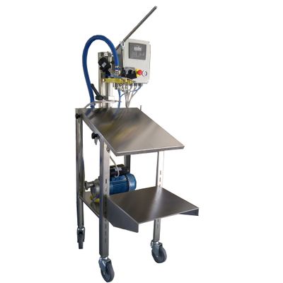 Semi-automatic filter for Bag-in-Box with capacities from 2 litres to 20 litres, for the filling of liquid and semi-dense products including foodstuff and other liquids (e.g. oil and wine a maximum viscosity of 300 cps). It is possible to perform hot filling at a temperature up to 50°C with a pump with delivery of 50 l/min. The dosing is made with with electronic liter-counter. It is possible to use any type of standard tap: Vtop, Press-Top and Flex-Top. Control of defective bag my means of a vacuum meter. The bag is positioned inthe fork; maneuvering the lever the stopper is removed and the filling tap is inserted in the bag. By pressing start you make the vacuum in the bag, later on the filling is made with tha addition of nitrogen. Maneuvering the lever again the stopper is inserted in the bag in box and the bag is extracted manually to make it slide in the box.