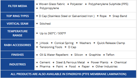 Reverse air bag house, in this type of filtration system, the bags are hanged vertically and mounted on a thimble. Here the filtration is done from inner surface of the bag hence the cake is formed inside the bag which needs to be cleaned in regular interval. IFF offers RABH Bags in all major Fabrics and Finishes. We also offer different accessories associated with the RABH bags.