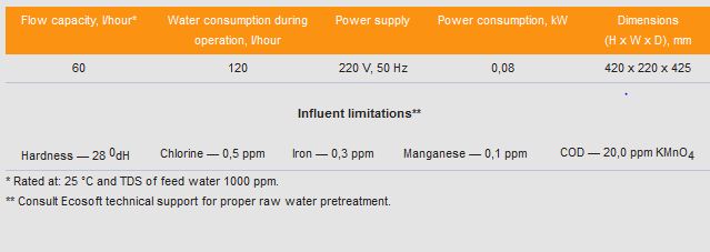 Removes: total dissolved solids, nitrates, chlorides, sulfates, hydrocarbonates and hardness.