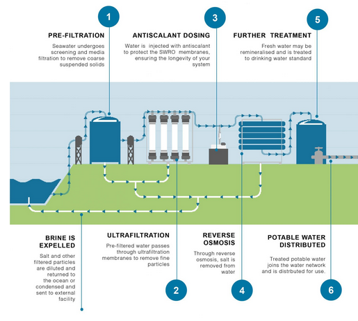 Although the specifics will vary depending on the project, the below diagram outlines the standard desalination process. As with most water treatment systems, desalination will ensure the raw sea water undergoes pre-treatment. This involves pre-filtration , ultrafiltration, and antiscalant dosing. These initial processes are crucial to optimising the performance of the SWRO and ensuring the longevity of your plant. Pre-treated water will then undergo reverse osmosis, whereby the salt is separated from the pure water. Having stripped water back to basic H2O, further treatment will often be required to ensure water meets drinking water guidelines. This process will likely involve the remineralisation of water. Water then joins the water network and is distributed for a range of applications.