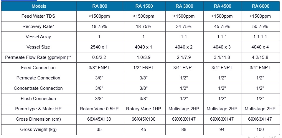 RA series systems are part of a family of reverse osmosis units specifically designed for operation with fresh and brackish feed waters having TDS values below 1,500 ppm. Customers can access these Models with permeate outputs of between 150 and 1,000 liters/hr (800-6,000GPD) as shown in the specifications.