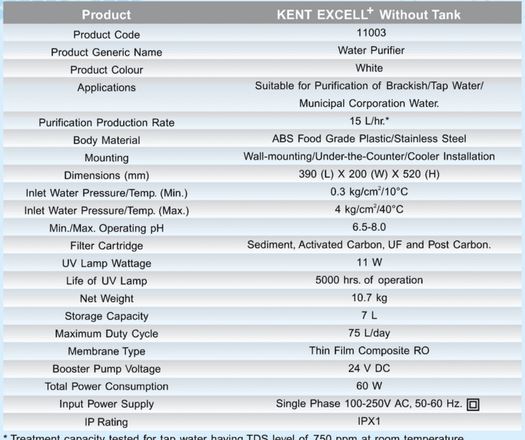 Kent Excell - Model Plus -Reverse Osmosis+UV+UF Under Sink Water Purifier