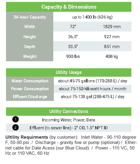 Low Profile, Countertop work surface for optimal use of space. Designed for medium to large volume food waste generators. Can process up to 1400 lbs (634 kg) of food waste per day. Comes equipped with our cloud-based technology solution to reduce food waste generation.