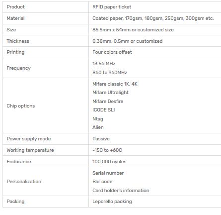 RFID paper tickets with HF/UHF choices for events. The advantage of RFID paper tickets is the low cost of materials and it is a environmentally friendly product. The RFID paper tickets are produced according to the customized request such as serial number, bar code, UID number, logo/name and photo.