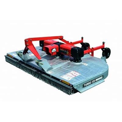 The super-duty Rhino® Turbo 96 & 120 rotary cutters are designed for use in demanding agricultural, commercial and industrial mowing applications. These units set the standard for premium design and performance in multi-spindle rotary cutters. Features include the patented Turbo DomeTM double deck design which incorporates a smooth top deck sheet for easy clean off and a lower deck sheet for protection from debris. Safety features include shielded drivelines and gearboxes and your choice of rubber deflectors, single