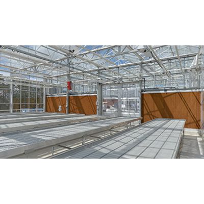 Cooling pads are installed vertically at the edges of the greenhouse. They feature self-contained irrigation and are combined with vertical ventilation that forces the air through the humid pads. The air is cooled by an adiabatic process.