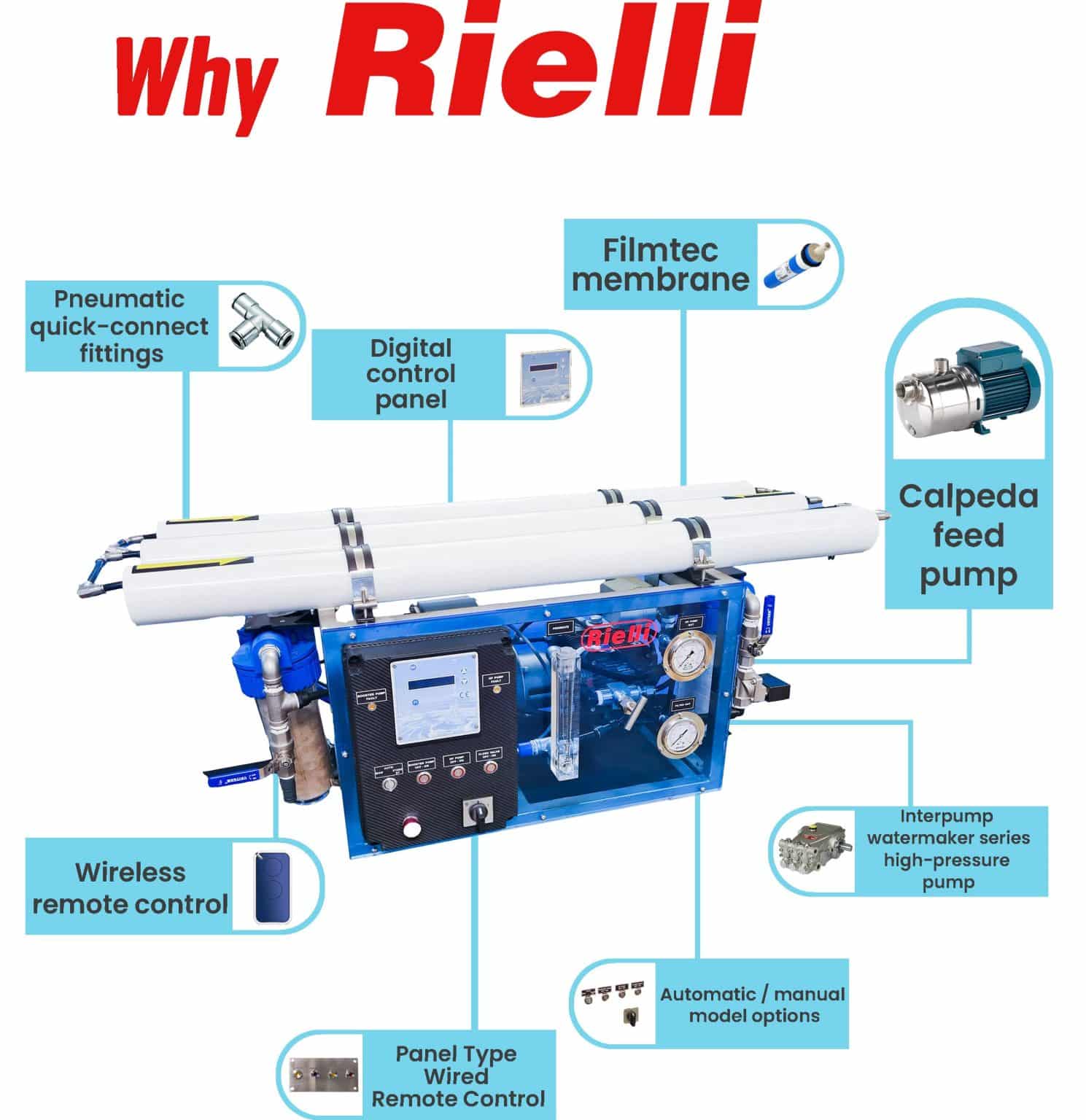 We’re Merging Our Expertise in Industrial Devices with the Marine Sector through Rielli Water Makers. Our 30-year accumulation of knowledge in industrial treatment devices, which has established us as Turkey’s global water treatment brand, has been utilized in the production of Rielli water makers. The water makers we specifically produce for boats will play a vital role in your long-term sea voyages. These special devices, by purifying seawater from salt and other contaminants and converting it into drinkable water, will become your closest companion in the open seas. Rielli watermakers heat the water to evaporate and then recondense this steam, thus removing potentially harmful pollutants, bacteria, and viruses.