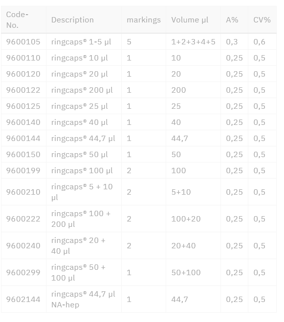 Ringcaps, disposable capillary pipettes with ring mark, DURAN®, certified conformity, with LOT number on the packaging, labelled with: usable until, ISO 7550, CE pursuant to IVD 98/79 EC.