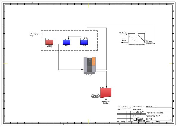 PURO safely separates the salt, surfactants, oil and dirt from the water. The distillate is added in the last sink and is then cascaded all the way into the first sink. There, the used rinsing water is removed and fed into the PURO. That which is lost through evaporation and carry-over during the cleaning cycle is replaced by reverse osmosis.