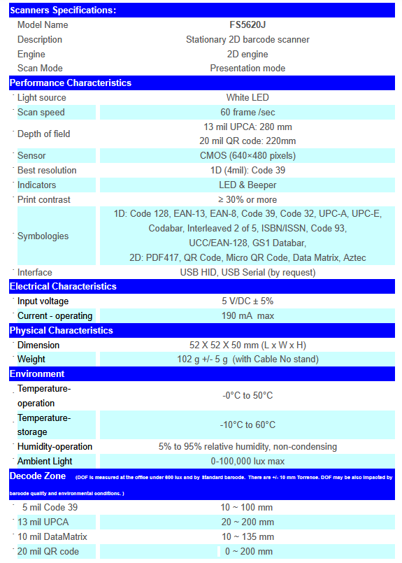 The FS5620J represents the high level of data collection devices. Using 2D imaging technology, FS5620J 2D stationary barcode reader provides a solution for OEM use into self-service kiosks, price checker, ticket readers, document handling, as well as vending machines.